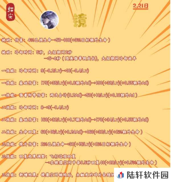 被动技能大招期间冷却减半,且后期降低技能冷却,三个技能的数值全部重新调整,加强基础和成长伤害,削弱AD,降低镜纯输出的高爆发,鼓励走半肉流的玩法。