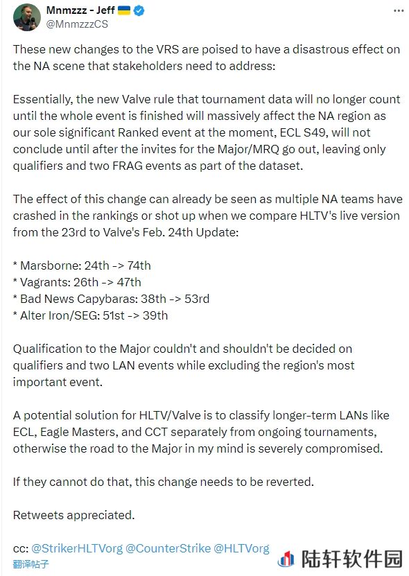 “这些新的VRS变动可能会对北美赛区造成灾难性影响,相关方需要尽快采取措施。