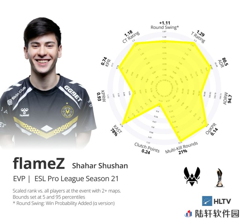 flameZ是那种罕见的总能在淘汰赛中挺身而出的选手,这次也不例外,他在小组赛中的rating为平平的1.13,而在淘汰赛中达到了1.33。