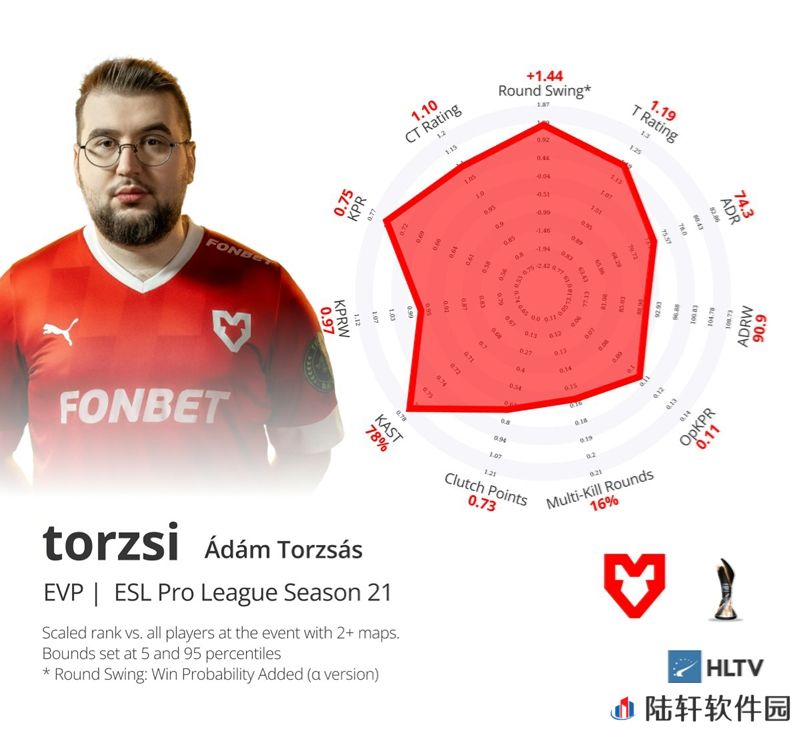 在MOUZ战队获胜的地图中,torzsi的优势依然明显,他的rating为1.33,RS为+3.82。MOUZ队员的数据受到了五张地图不敌Vitality的惨败以及一段艰难赛程(与Top5战队进行了8场地图比赛)的影响,但他们的狙击手torzsi还是凭借出色表现获得了赛事最后一个EVP荣誉。