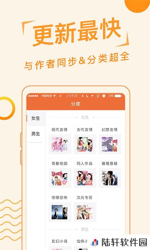 6、男频和女频的小说不尽相同,男生和女生可以一次找到符合自己取向的海量小说。