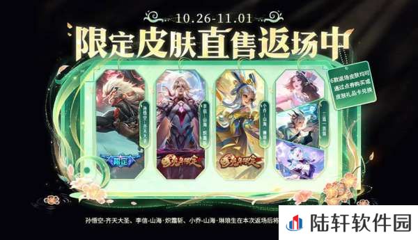 龙年限定的安琪拉聚宝船、大乔忆丹青、孙尚香问璇玑、孙策淬吴钩、赵云铭钟鼎,情侣皮肤吕布貂蝉的曦玄引,海诺朵莉亚的心动手记,大司命少司缘的东方月初和涂山红红。