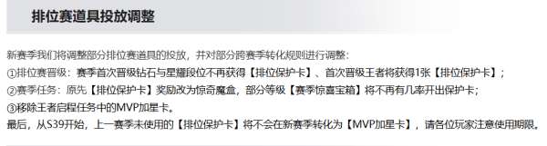 移除了王者启程任务中的MVP加星卡,而S39开始,上赛季没使用的排位保护卡也不会转化成加星卡了。