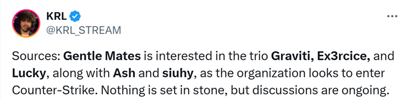 “Gentle Mates俱乐部有意签下Graviti、Ex3rcice和Lucky这三名选手,以及ash和siuhy,因为该俱乐部正计划涉足CS领域。目前一切尚未确定,但相关讨论仍在进行中。 ”