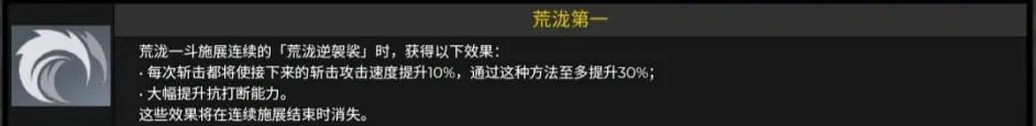 每次斩击都将使接下来的斩击攻击速度提升10%,通过这种方法至多提升30%;.大幅提升抗打断能力。