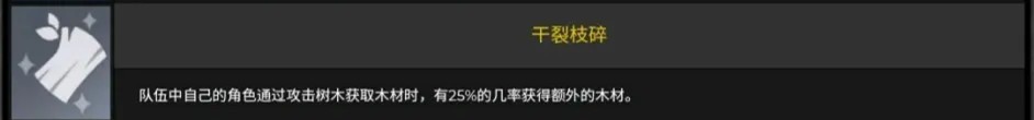 队伍中自己的角色通过攻击树木获取木材时,有25%的几率获得额外的木材。