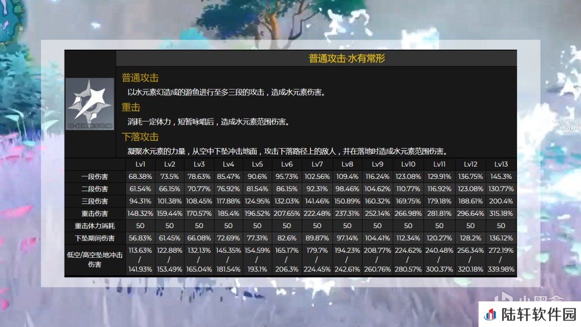 水有常形,以水元素幻化为游鱼,进行至多3段水元素伤害。普攻的倍率各项数值都接近可莉,不过毕竟是新设计的角色,在衔接上会稍微顺滑一些。