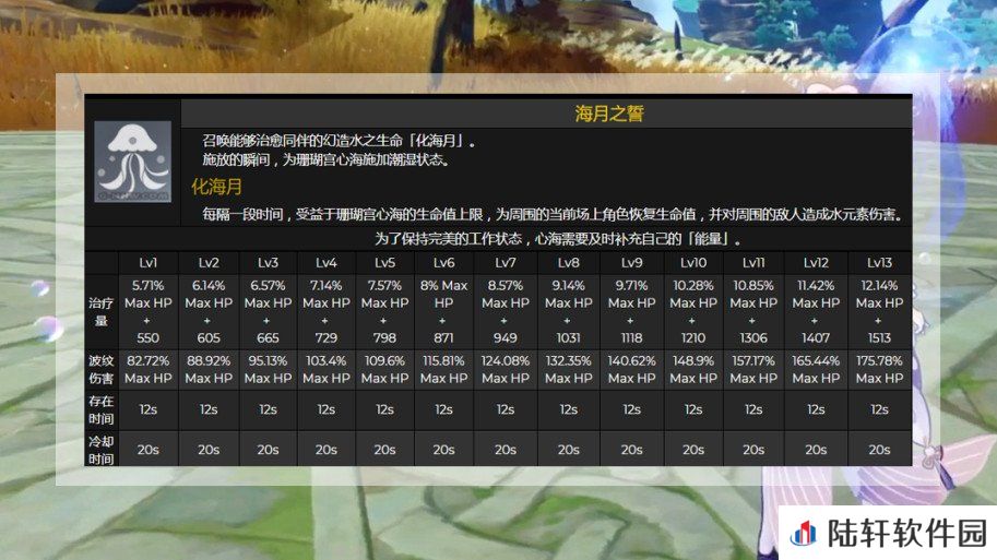 海月之誓,召唤治愈同伴的「化海月」,在释放瞬间会为珊瑚宫心海施加潮湿效果,有些类似行秋。化海月持续12秒,每2秒对周围敌人造成一次伤害基于自身140%最大生命值的伤害(不太合理),并基于自身生命值9.7%+1118的数值治疗全队。后面冻梨会简单计算一下该技能的伤害,反正离谱就对了。