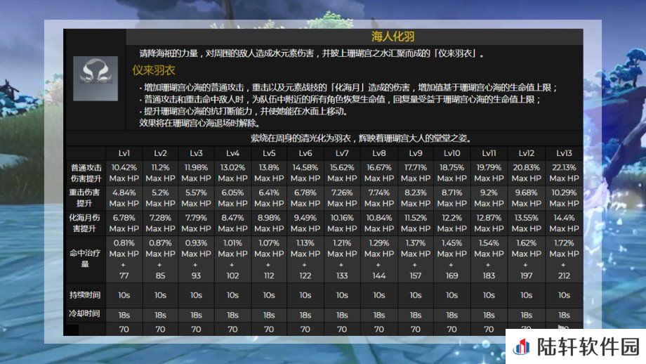 海人化羽,为自身施加「仪来羽衣」的效果,持续10秒。期间心海的普攻、重击、元素战技都会基于生命值获得额外的伤害,并且提升抗打断能力,还可以在水面行走。此时普攻或重击命中敌人时,会基于自身最大生命值来治疗全队。