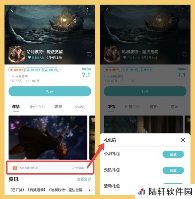 2、进入《哈利波特:魔法觉醒》游戏详情页(左图),【攻略】旁边再旁边的那个页面