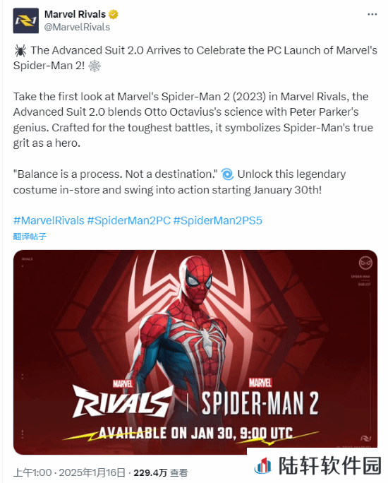 PS和《漫威争锋》官方推特共同宣布了这一消息,预计这款全新外观将于1月30日加入《漫威争锋》,值得一提的是,当天也是《漫威蜘蛛侠2》登陆PC平台的日子。