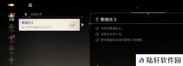 这个任务有三个要求,第一个要求就是寻找传说中的菲鲁兹队长,第二个任务就是一位长生军士兵中的首领,第三个任务便是协助长生军寻找一系列稀有材料,从而满足清单上的所有需求便可以完成任务。