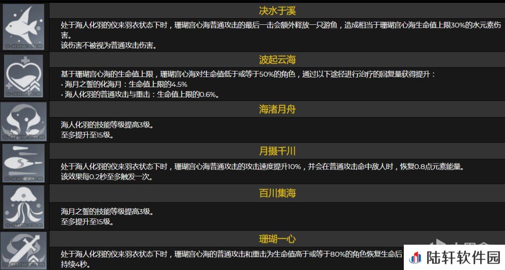 珊瑚一心:处于海人化羽的仪来羽衣状态下时,珊瑚宫心海的普通攻击和重击为生命值高于或等于80%的角色恢复生命后,将获得40%