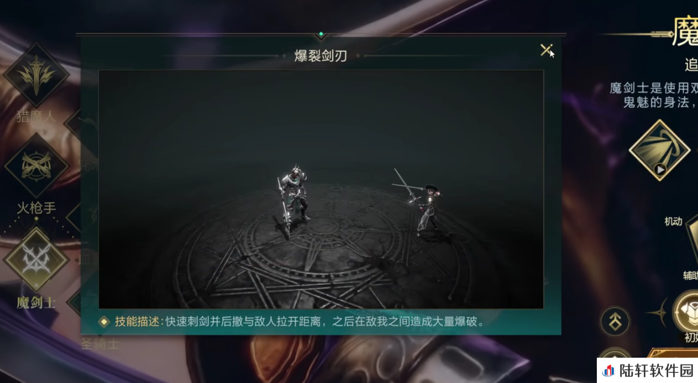 魔剑士在游戏当中是一个能够使用恶魔之力的职能,它在游戏内总共有四个技能,第一个技能是魔剑之气,魔剑士会突然向天空之中跃起,对前方的目标发出突刺,在突刺判定之后,魔剑士会连续向敌方单位目标造成四次魔气冲击,在魔气冲击的期间,魔剑士会处于霸体状态。