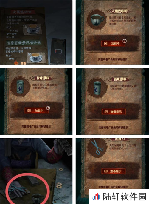 使用小物件开咖啡馆门,在吧台按菜单配方做大焦热咖啡,并获取甘味、苦味原料。