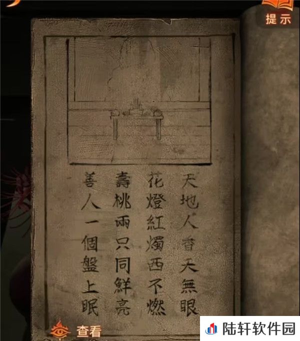 3、暂时没有更多线索,查看一下无字书吧,果然出现了线索,结合供桌上的东西理解一下,香叫天地人,那么天无眼就是天的那根香不要点亮,花灯和红烛西边的不点燃,一般来说上北下南左西右东,也就是左边的不亮,只点右边的,寿桃是两个都要亮的,调整一下供桌上的东西。