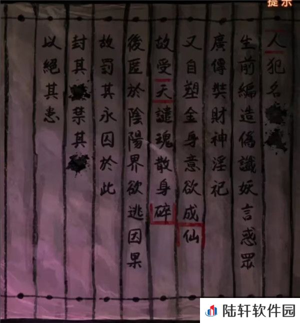 6、不过先不着急过去,先查看一下最左边,看不到的位置还有一个牢房,查看纸人前面的竹简,注意有几条红线,上下都有红线的是天和人,然后形状很奇怪的红线一个是将碎下面包起来,一个是将仙上面包起来,暂时没有更多线索先记下来。