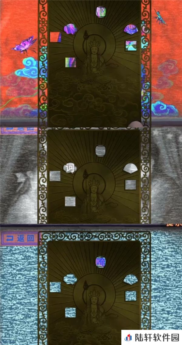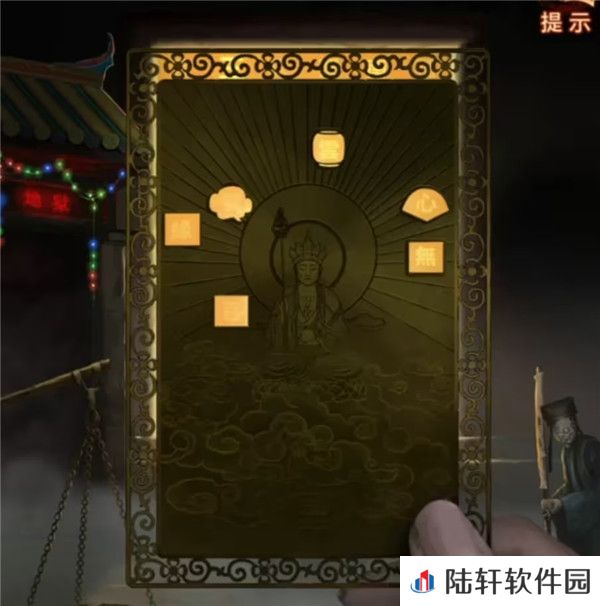 2、先拿出带孔的小卡片,果然菩萨后面的背景墙上的字会出现在小孔里面,记一下长方形=缘,云朵=赞,正方形=菩,灯笼=云,扇子=心,又一个正方形=无,因为有相似的图形,所以这个可能不是形状线索,把字亮起的顺序也记下来缘-心-无-云-赞-菩,这里其实是循环亮起的,所以第一个字不一定是缘只是记下顺序而已。