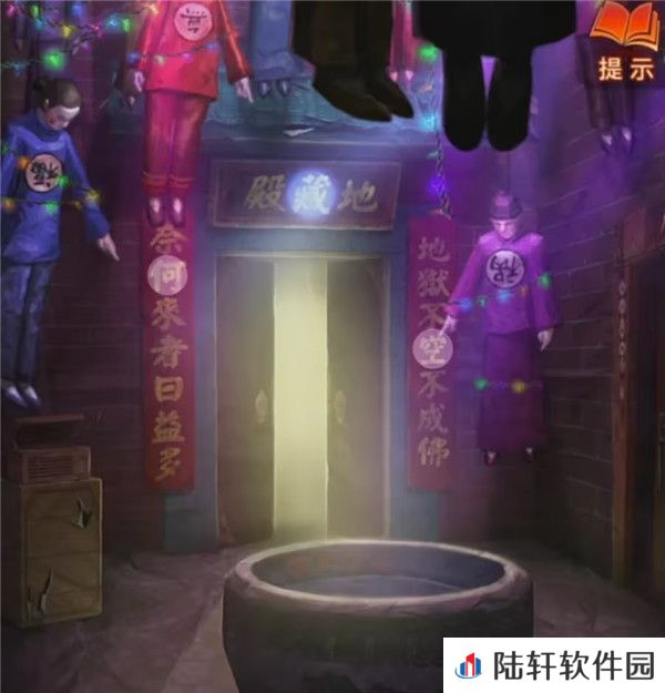 15、查看一下乐队后面的大屏幕发现已经完成了一个任务了,也就是不遮挡黑无常视线,那么把木鱼棒喝哀杖交给后面的架子鼓手,果然又完成了一个任务,查看一下右边的棺材拿到唱片和算盘,出门来水缸场景,对左边的唱片机使用唱片后氛围感就出来了,记下来无=藏,福=何,祸=空。