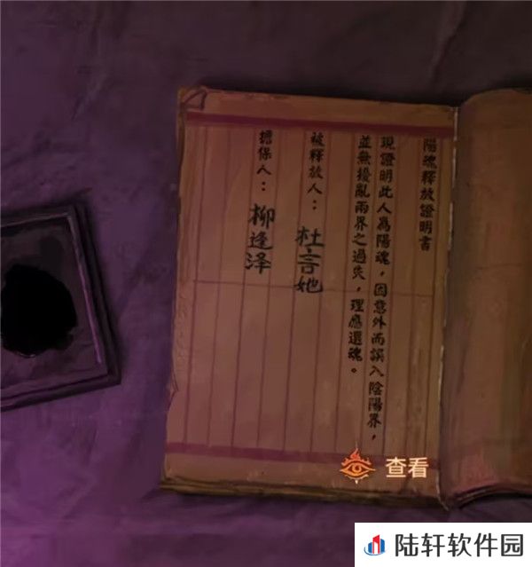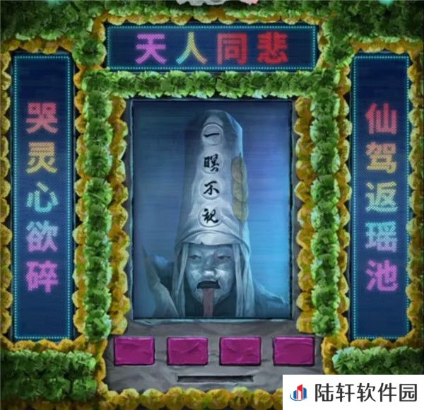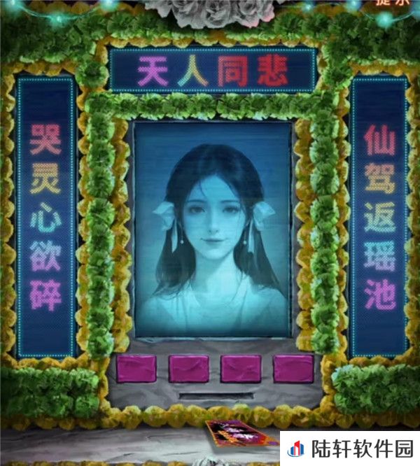 10、出门来到阴阳牢,先使用毛笔在桌子上登记一下吧,登记结束后从牢狱手中拿到女主照片,再次回到剧场,查看一下舞台上色彩斑斓的赛博灵台,点击照片最下面的那个花坛,花坛移动后出现四个按钮和一条缝,对那条缝放入女主照片后就可以开始调整了,第一个按键是中间照片,自然是调整为女主了。第二个按键是左边的对联,第四个按键是右边的对联,我们前面竹简上看到被上包围的字是仙,被下包围的字是碎,也就是左右对联必定有第一个字是仙和最后一个字是碎的,那么能用的对联也只有哭灵心欲碎和仙驾返瑶池了,竹简上被上下划红线的字是天和人,也就是最上面的横批要有天和人字,那么第三个按钮调整的上面只能是天人同悲了,调整好后如下图拿到入场券。