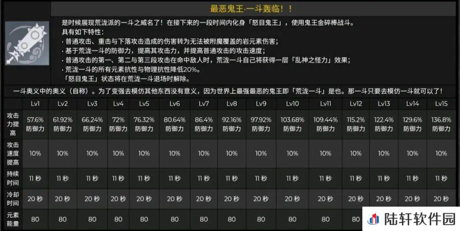 3:普通攻击的第一、第二与第三段攻击在命中敌人时,荒泷一斗自己将获得一层『乱神之怪力』效果