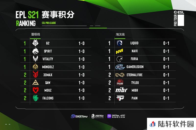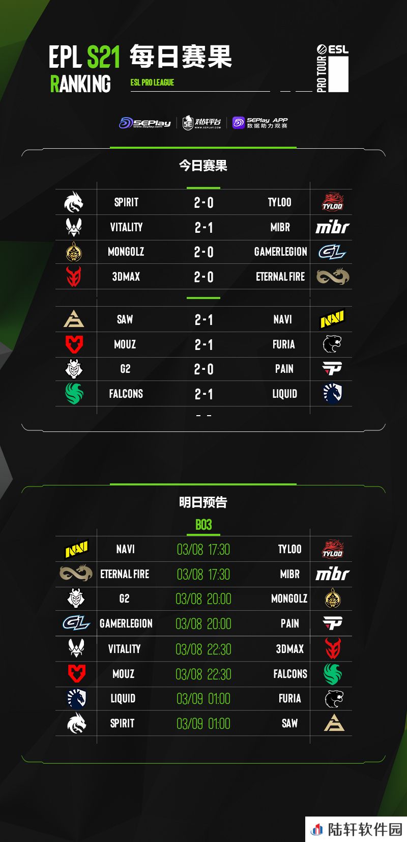 EPL S21首日比赛已经结束,在首日比赛中,中国战队TYLOO不敌Spirit,掉入0-1组,绿龙则是成功晋级1-0组。同样为1-0组的还有Vitality、The MongolZ、3DMAX、MOUZ、G2、Falcons和SAW,其中SAW爆冷战胜了Natus Vincere,3DMAX则是战胜了顺位更高的Eternal Fire,这是首日比赛中两场爆冷赛事。在明日比赛中,TYLOO将迎战NaVi,G2对阵Mongolz,Falcons对战MOUZ。以下为今日赛果和明日预告: