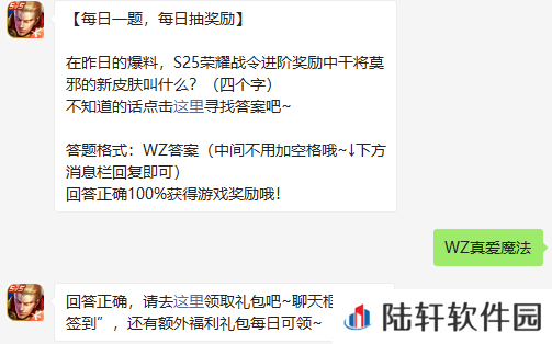 在昨日的爆料,S25荣耀战令进阶奖励中干将莫邪的新皮肤叫什么?-王者荣耀2021年微信9月7日每日一题答案分享一览[图文]