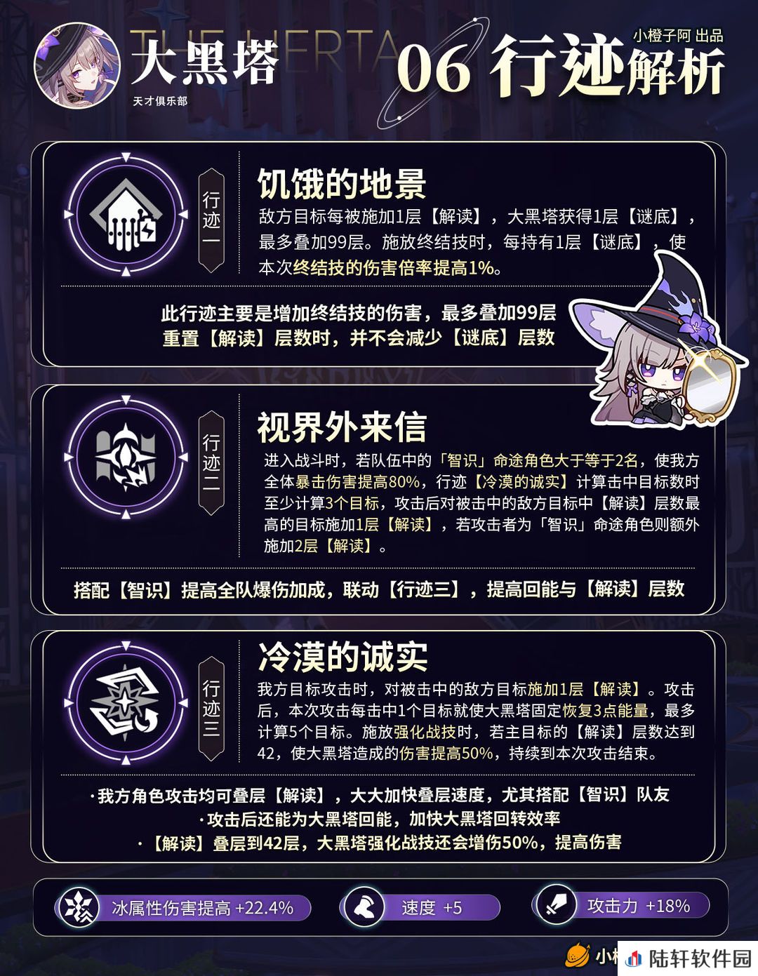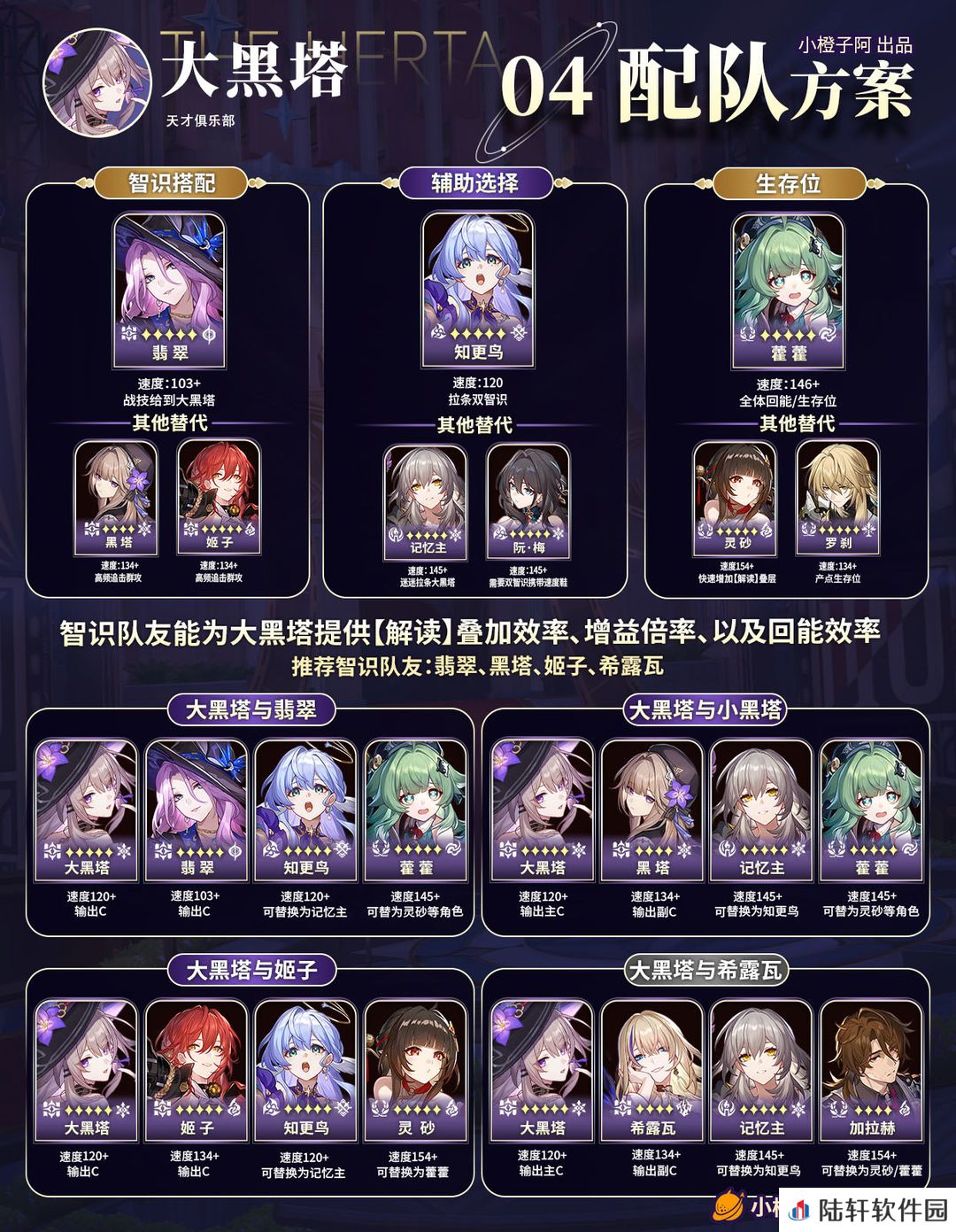 ②智识队友选择:智识队友需要具备高频出手与对群输出能力,能为大黑塔提供【解读】叠加效率、【解读】增益倍率,以及大黑塔回能效率等重要增益。