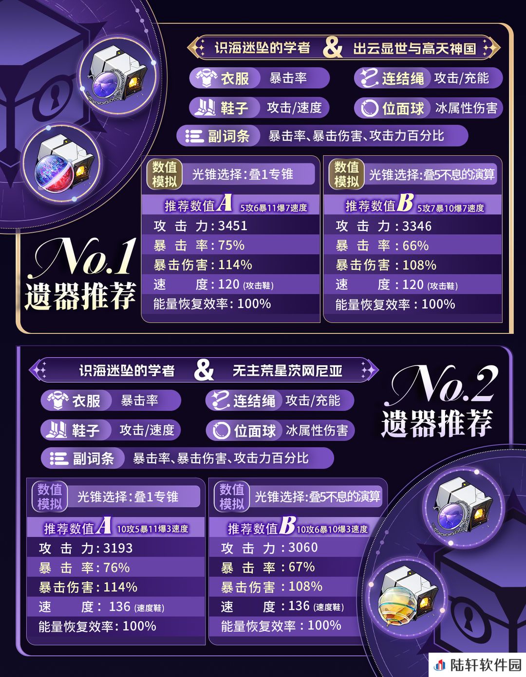 ② 内圈遗器首推【出云显世与高天神国】,大黑塔需要搭配一个智识,恰好可触发遗器效果,加攻与刚需的暴击加成;其次推荐【无主荒星茨冈尼亚】,增加双暴加成。