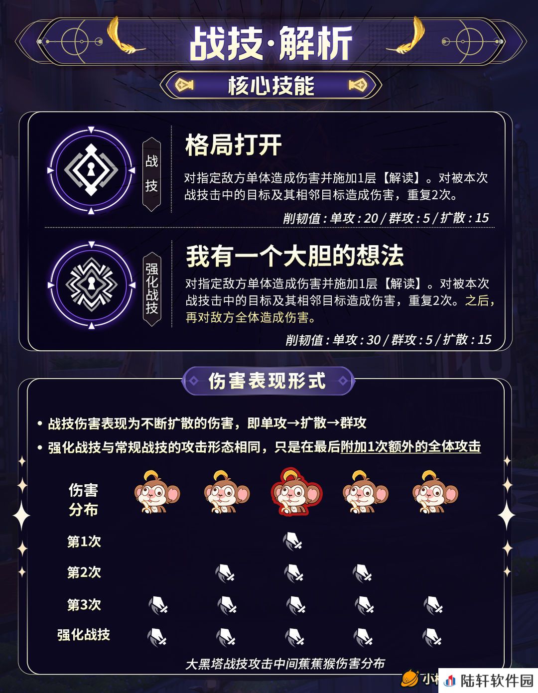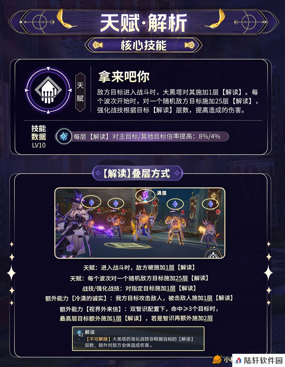 ② 只有强化战技才能根据【解读】层数提高伤害,10级天赋每层【解读】对主目标/其他目标提高8%/4%,如果队伍中有其他智识角色,每层再对主目标/其他目标提高8%/4%。