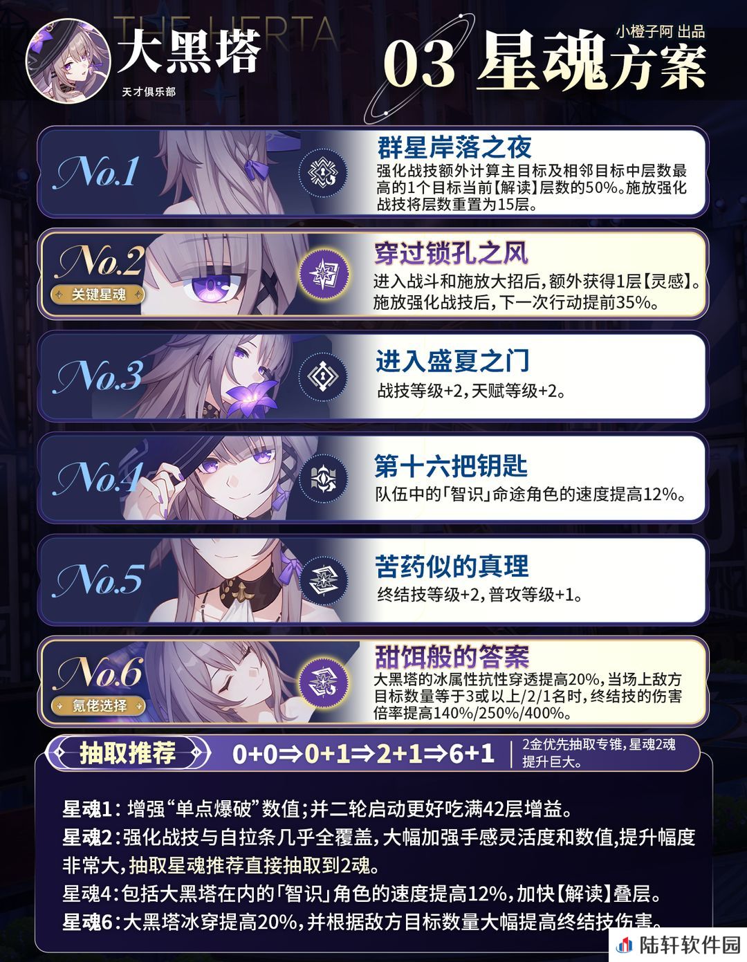 ② 2魂使得强化战技几乎可以做到全覆盖,如果没有2魂,大黑塔需要穿插战技,而点亮2魂,进战就可获得1层【灵感】,释放终结技可以获得2层【灵感】,这让大黑塔释放强化战技的频率变得非常高,并且释放完强化战技还能拉条35%,大黑塔的站场频率也得到提高,大幅加强手感灵活度和数值,提升幅度位列2魂第一梯队,推荐抽取。