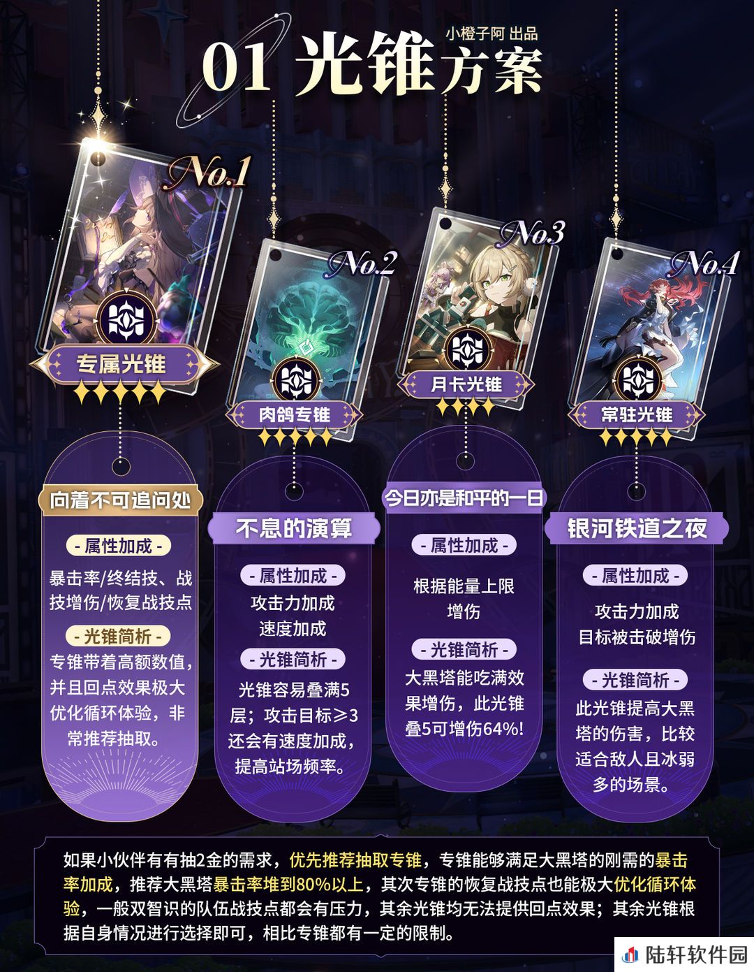 优先推荐小伙伴抽取专锥,下位比较适合的光锥都没有暴击加成,只能依靠遗器来补,这就导致遗器堆暴击压力挺大的;其次就是下位光锥也没有能恢复战技点的,大黑塔需要搭配其他智识角色,双智识配队战技点有压力,回点能力决定能否打出理论上限,综上所述推荐小伙伴2金优先0+1。