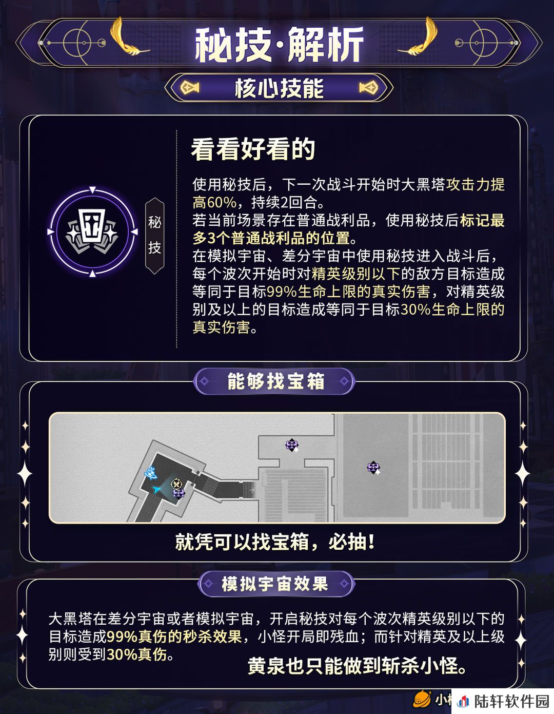 ——不过“大黑塔+智识”在实战中击杀敌人后已较能达成大招收42层的效果,灵砂提供的高额击中数并非必需而是多多益善。
