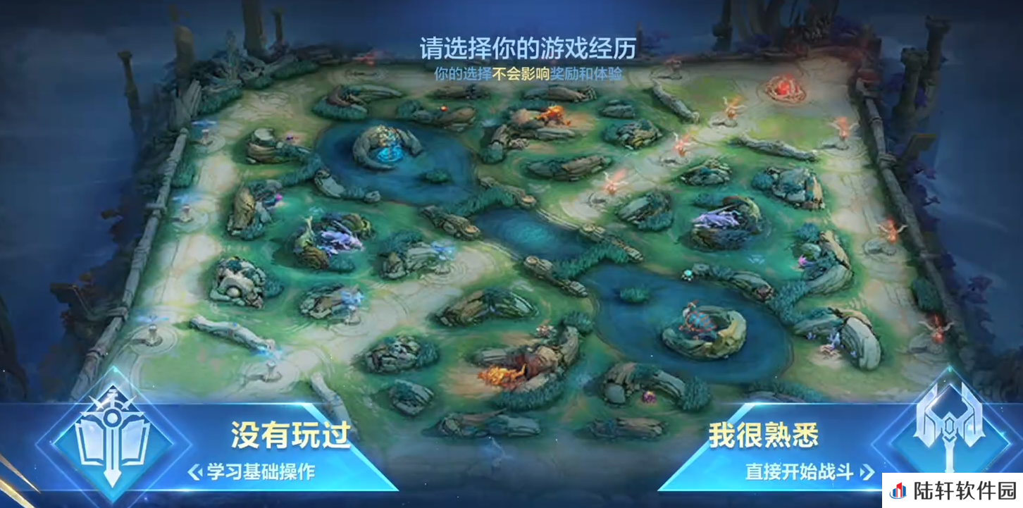 这次的教学基本上是完全仿照正常玩法来进行的,但是咱们不管是敌人还是队友都是机器。在一开始的界面我们选择好角色,然后便会进入到游戏之中。进入游戏之中,咱们一共有3条路线,5个人。一般正常的打法是上路一人,上路又被称之为经验路,这条路的敌我双方的攻击是最激烈的。一般来说上路的角色都是单挑或者机动能力较强的战士角色,但有时一些对此路非常精通的玩家也会选择一些自己较为擅长的输出角色来进入到此条道路上。