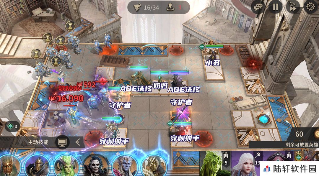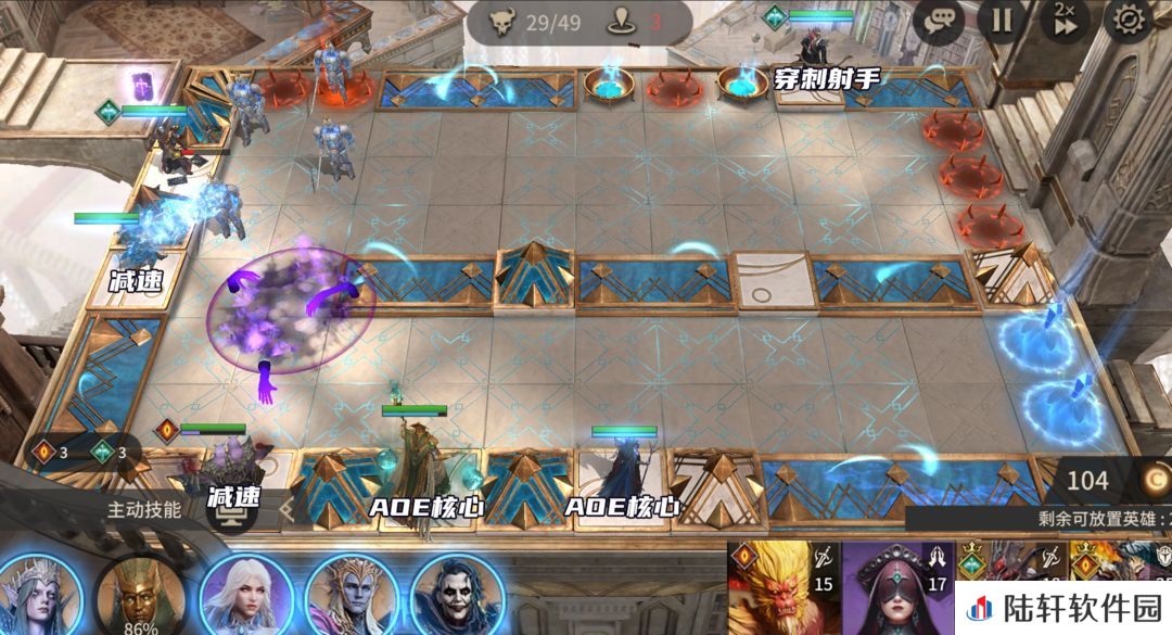 左上角会刷愚者,会形成领域对周围造成伤害,放置穿刺射手打掉即可。这个位置还会有闪电守卫,所以要求穿刺射手有足够的输出。地图中两个穿刺射手均会受到攻击,可以用哈洛、涡流这类范围较大的奶妈提供续航(方向朝下)。这关左侧的守护者要承受大量的攻击,如果AOE法核战力高于7.5W可以快速清怪,否则就要有更高的坦度及续航支持。右上角主要是刷高阶毁灭者,坦度特别高,最好是用小丑来打。左侧的AOE法核有新娘用新娘,没有可以用贪婪、伊欧娜。我这边输出够就没放置守护者,如果数值不足就要多带一个守护者。