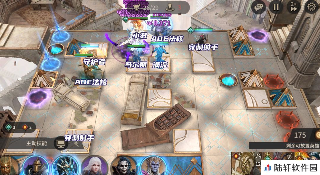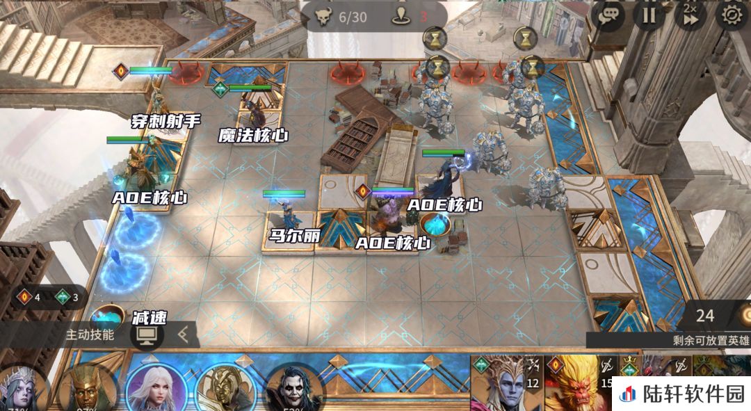 右上角会刷修复师,主要用穿刺伤害大,可以用哈苏、弋德莉尔的穿刺射手。马尔丽放置在战场中心位置,提供批量减速、易伤,其他高台位放置AOE输出核心即可(所有的魔法输出英雄都可以拿出来用)。