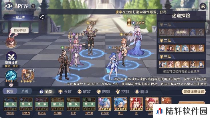 3、碰到有一个队伍打不过的情况,可以看看战报,把能打过的并且回合数少的那个队伍拆开,去支援打不过的队伍,最极限的情况就是三队都是19或者20回合打过。参考阵容如下: