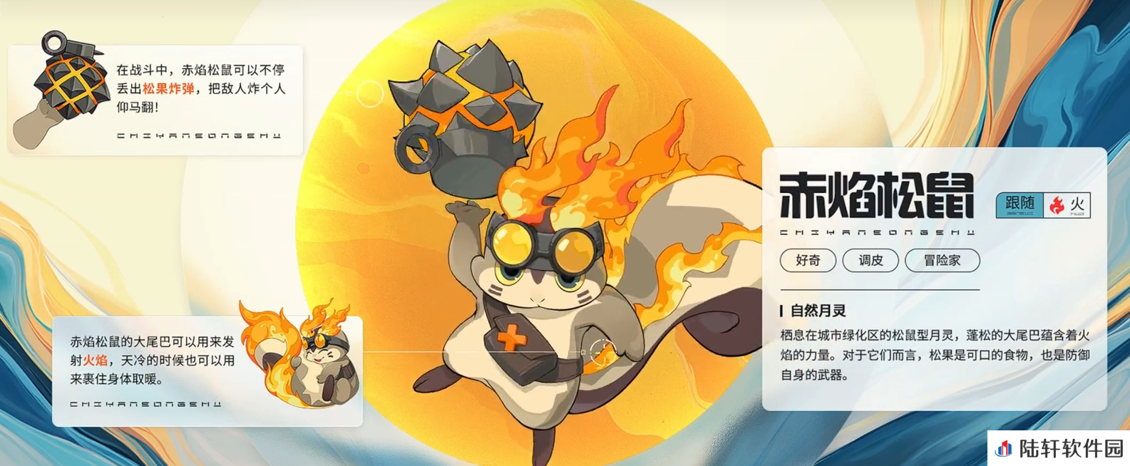 最后介绍的是赤炎松鼠,这个也是自然月灵,它本身也是一位自然月灵。它的属性也是火属性。这位月灵的能力是在战斗的时候可以不停的丢出松果炸弹,这个炸弹在对敌时的威力还是挺大的。