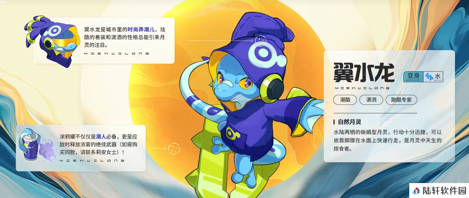 接下来第二个则是翼水龙,这个也是属于自然月灵,本身的属性为水。它拥有着变身的能力。这位月灵很喜欢各种时尚有趣的物品,咱们在和水有关的地域使用它会获取更大的效果。