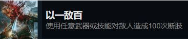以一敌百:同样是以任意的武器,然后造成100次左右的断肢。这一个技能和百战无前是比较相似的,并不需要刻意的去刷,一般在战斗中留意断肢的操作即可。